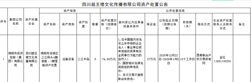 四川越王楼文化传播有限公司资产处置公告