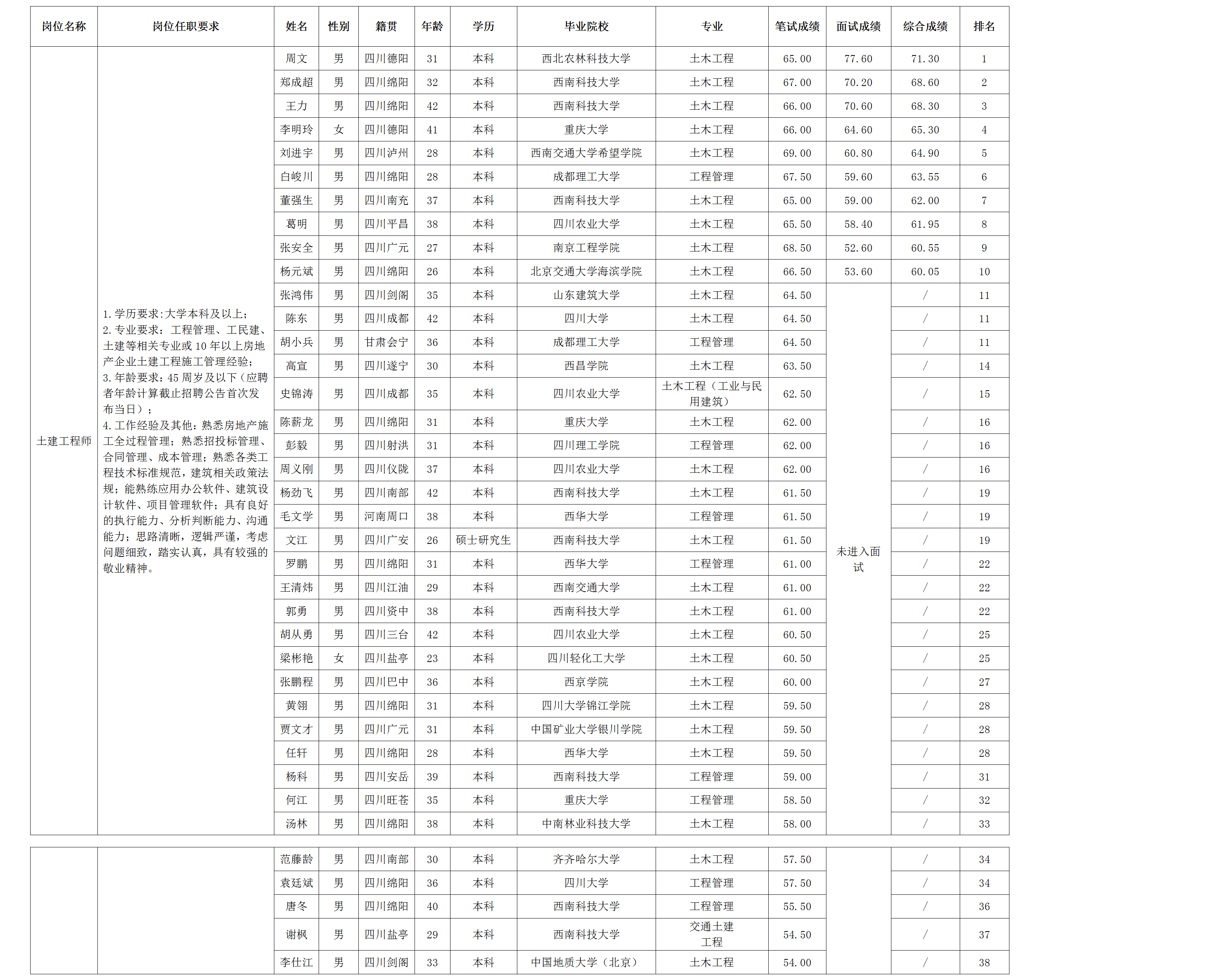 【公开招聘】绵阳市PP电子平台置地有限公司关于土建工程师岗位测试成绩的公示