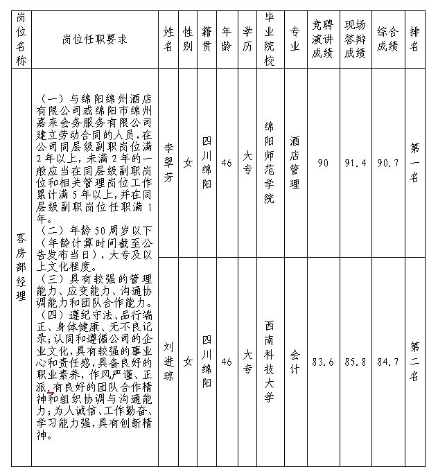 根据绵阳市绵州嘉来会务服务有限公司发布的招聘公告及招聘相关规定,经竞聘演讲、现场答辩等程序,现将竞聘成绩予以公示。