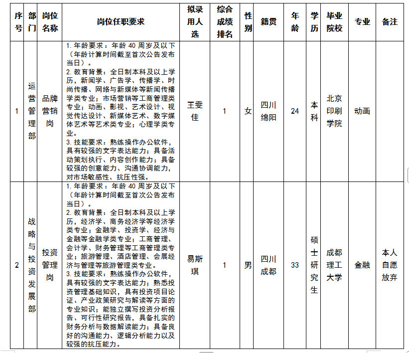 根据绵阳文化旅游发展投资集团有限公司发布的招聘公告及招聘相关规定,经笔试、面试、背调、体检等程序,拟录用王雯佳同志到绵阳文化旅游发展投资集团有限公司工作,现予以公示,具体情况如下:
